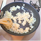 フライパンにサラダ油をひき、しょうが・にんにくを入れて弱火で炒め、香りが出てきたら玉ねぎを加え、透き通るまで炒める。