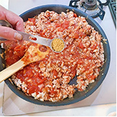 ③にカットトマト缶、コンソメ、豆類、ローリエの葉、(A)を加えて全体を混ぜ合わせ、そのまま水分を飛ばしながら15分ほど煮込む。