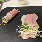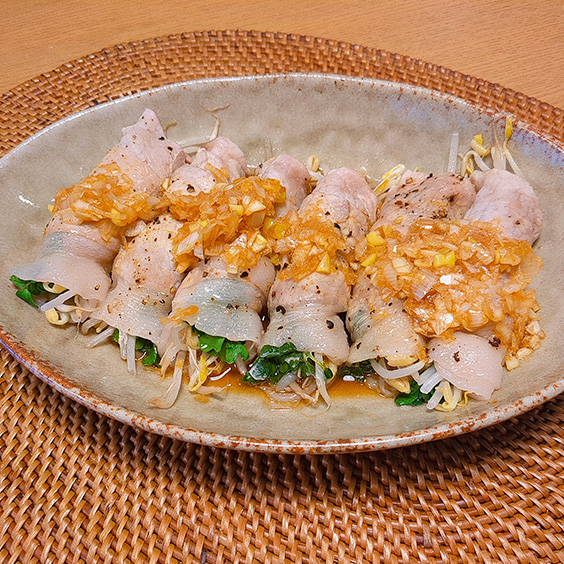 豚肉は2枚をずらして重ね、塩・胡椒をし、もやし・カイワレ大根を巻く。