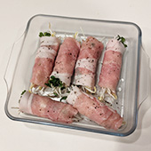 巻き終わりを下にして耐熱皿に並べ、酒を回しいれ、ふんわりとラップをかけ電子レンジ600Wで6分加熱する。