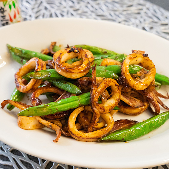 オイスターソースのコクと辛蔵【辛三昧】のピリッとした辛さが相性抜群のイカのガーリック炒めです。