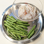 いかは皮はむかず、わたを除く。胴は1cm幅の輪切りにし、足は食べやすい大きさに切る。いんげんはへたをとり、斜め3等分に切る。にんにくはすりおろす。