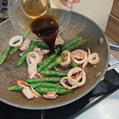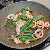 フライパンにサラダ油、にんにくを入れて熱し、香りが立ったら、いか、いんげんを強めの中火で炒める。